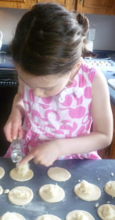 When Harper wakes up it's like there is a switch that gets turned on. There's no slow return to consciousness, it's up and at 'em right away. This morning she was out of bed, "GeMornin Mommy, I go downstairs!" So I hear her go down the stairs, run at full force to the kitchen and drag the stool over to the cupboard, the whole time yelling, "My have bekfast!" She is a constant ball of energy in the morning, only sitting long enough to have her usual three breakfasts. Between these breakfasts she runs from room to room chattering constantly and moving from one activity to another until she finally finds what she wants to do. She's also the morning greeter who runs over to whomever has emerged from upstairs calling out, "GeMornin, Daddy (or Hannah or Momma)!"